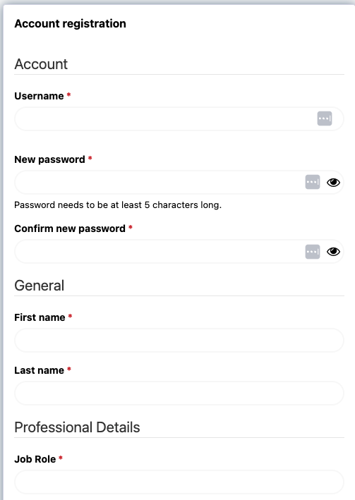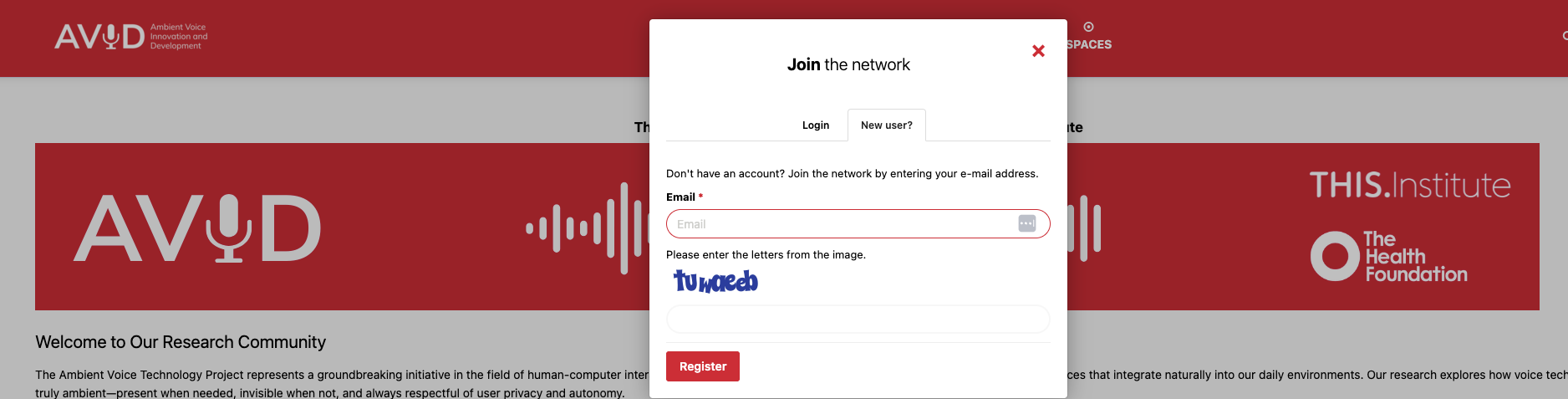 Go to https://ambientvoice.thiscovery.org and click Sign up - the Join the network screen will pop up.